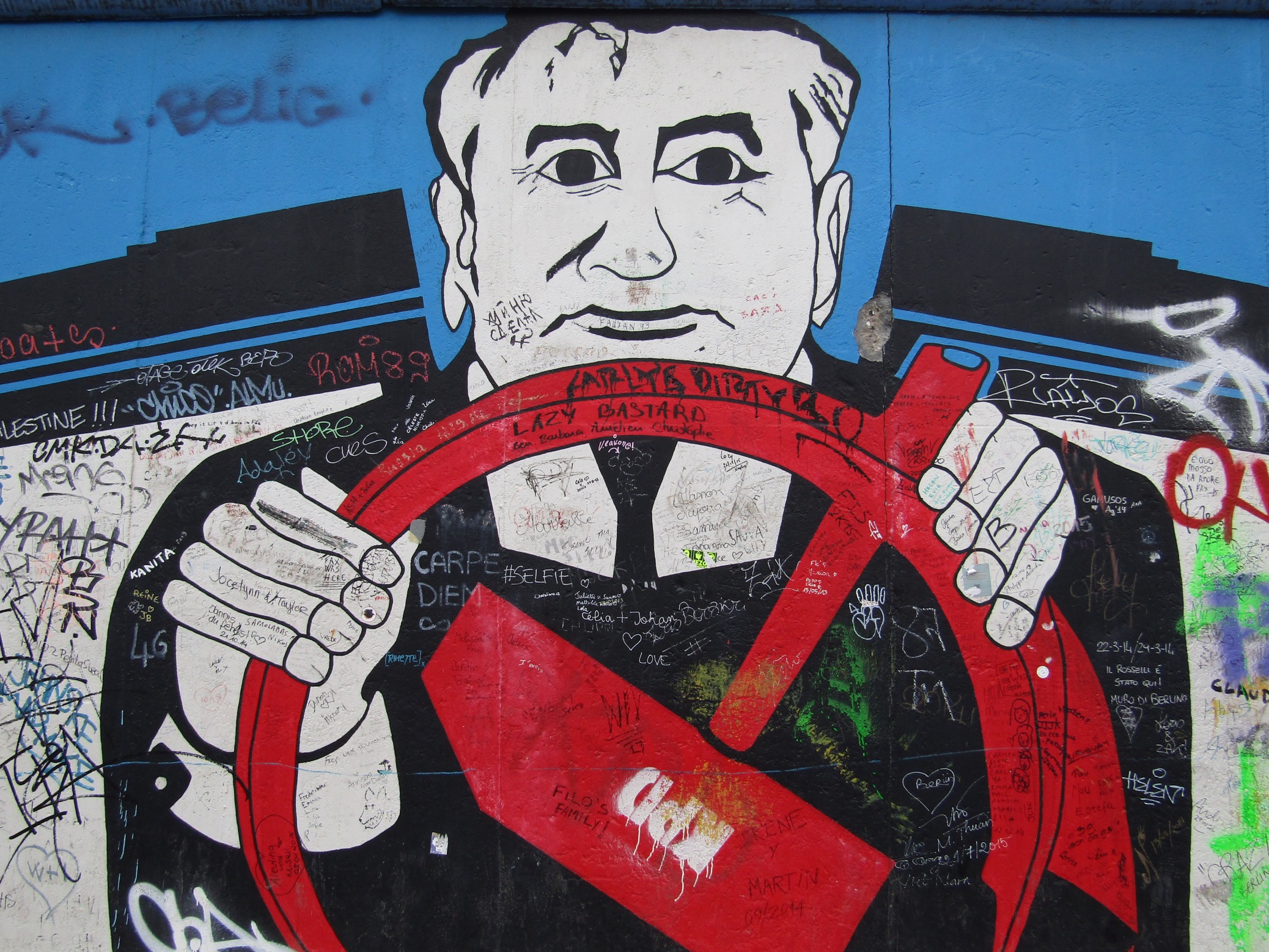 One of the most famous pieces at the East Side Gallery, entitled “My God, Help Me to Survive This Deadly Love” by Dmitri Vrubel recreates a famous photo of Soviet Chairman Leonid Brezhnev and East Germany Chairman Erich Honecker engaging in a kiss.