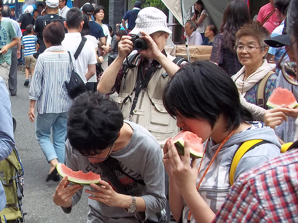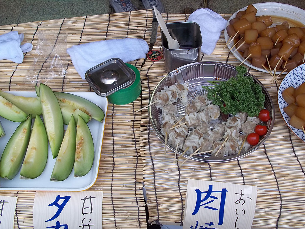 We chose the Shitamachi Tanabata in Tokyo’s Kappabashi District in the shadow of the Tokyo Skytree. More than half-a-mile of street was closed off to traffic and lined with vendors serving all sorts of festival fare, including a rare vegetarian treat—deep-fried soybean “meat” on a stick!
