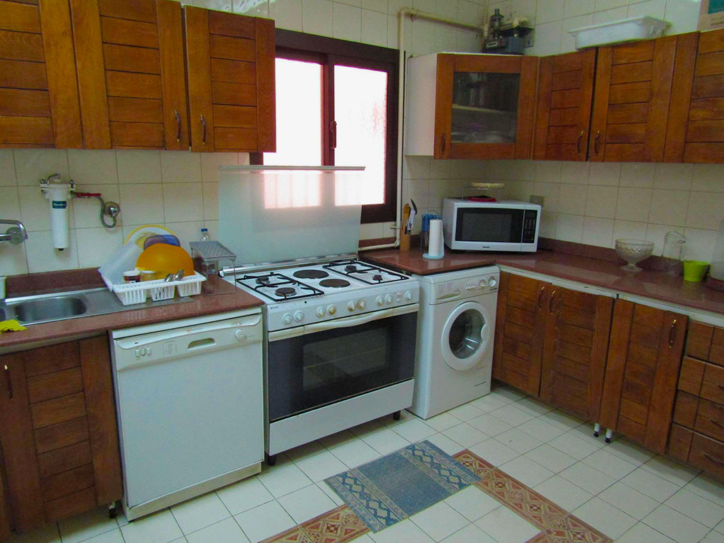 The downsides were that it is a little dark; the kitchen is hiding in the back of the flat with no windows to let in the light. The living/dining room needs a few rugs to warm up the stark white tile floors. Although the kitchen is tiny, it has cool wall tiles that looked like vintage Arabic advertisements. This complex has a daycare in one of its units, but we were assured that the hours are when we are at school and it doesn’t operate on the weekends. House 2 is the cheapest flat.