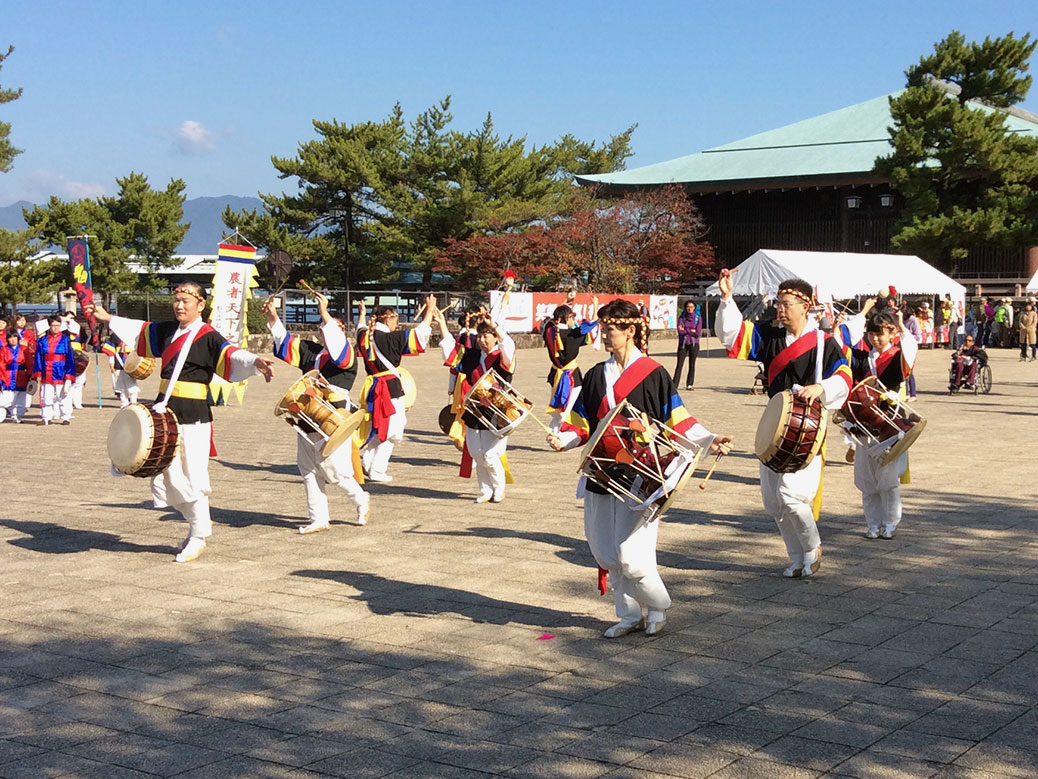 In fact, we arrived so early that none of the shops on Miyajima’s shopping street had opened yet. Around 9 a.m., we finally spotted a cafe propping its doors and stopped in for coffee. Continuing down the street, we tried some of Miyajima’s famous maple leaf cakes and spotted one of the island’s novelties: the world’s largest rice scoop. A Korean dance group set up near the ferry terminal, the rhythmic beat of their drums audible all over the island.