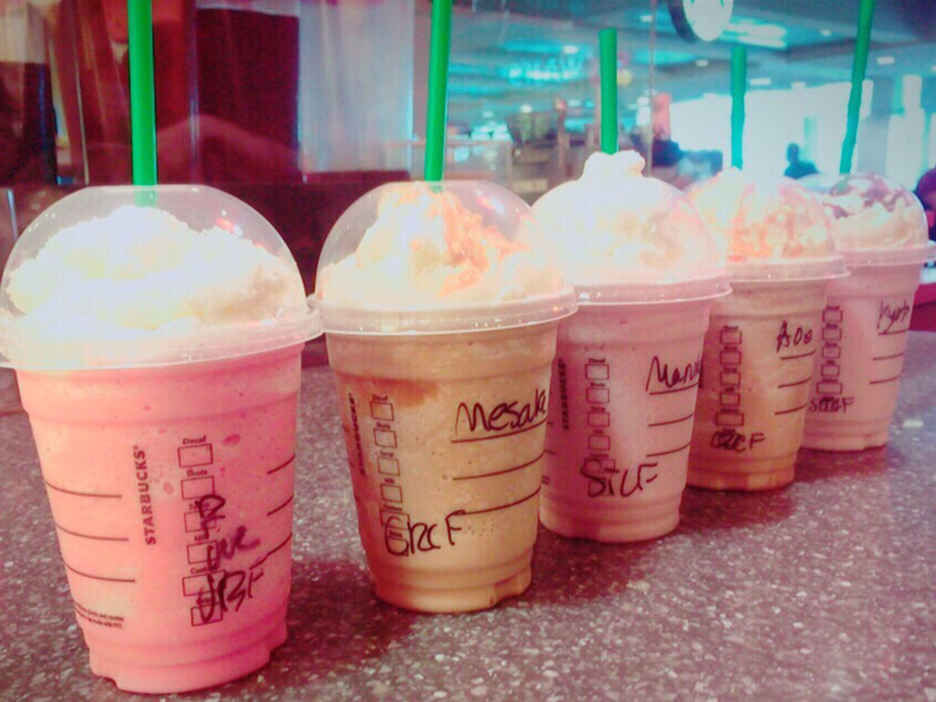 Starbucks in the U.S. is a lot sweeter than in Japan… this photo featuring some secret menu drinks like Cotton Candy Frappuccinno.