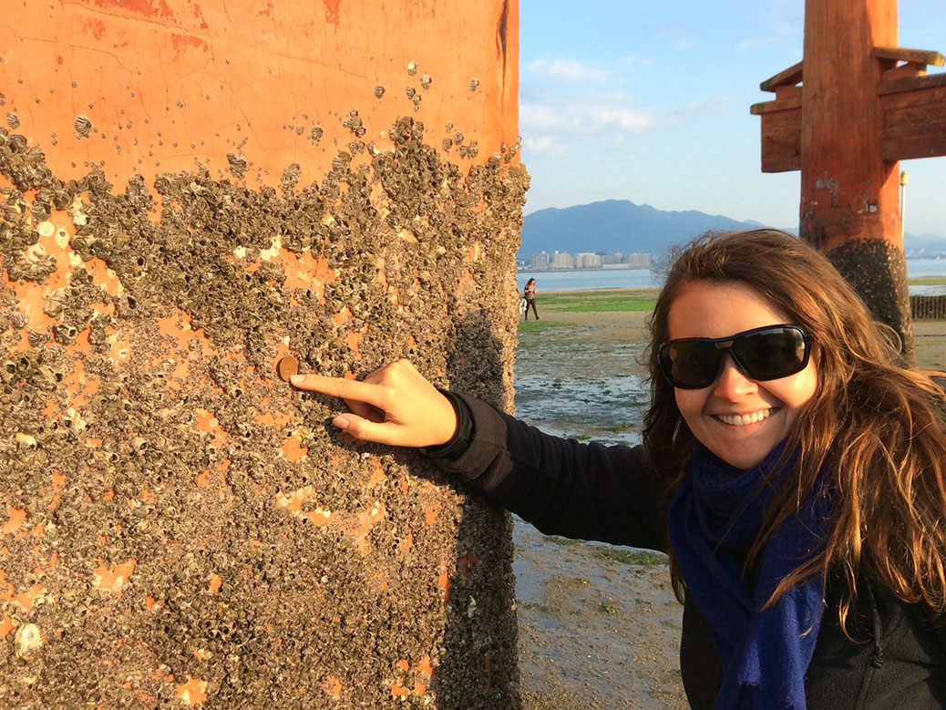 In fact, we arrived so early that none of the shops on Miyajima’s shopping street had opened yet. Around 9 a.m., we finally spotted a cafe propping its doors and stopped in for coffee. Continuing down the street, we tried some of Miyajima’s famous maple leaf cakes and spotted one of the island’s novelties: the world’s largest rice scoop. A Korean dance group set up near the ferry terminal, the rhythmic beat of their drums audible all over the island.