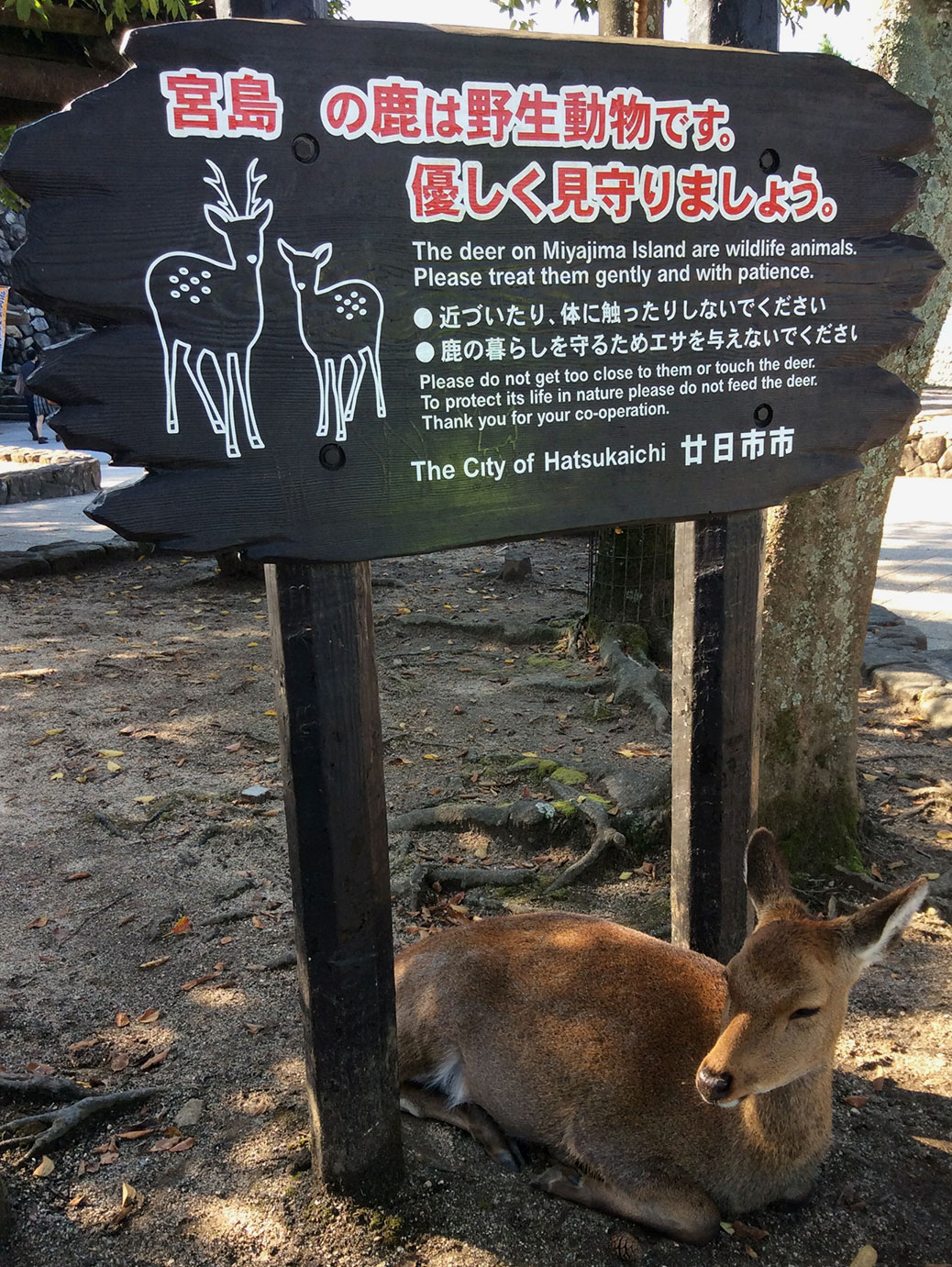 While the torii and the shrines are the main draw, Miyajima might be just as famous for its wild deer. After living with generations of tourists, the deer are mostly docile and don’t really care about the thousands of people walking through their home. However, when feeding time comes, they turn into quite a nuisance, digging into bags or just swiping things out of people’s hands. As we watched the sunset, a deer with a cataract came up and snagged our map of the island out of our bag. He chewed it and swallowed it down, his creepy cloudy-white eye staring at us the whole time.