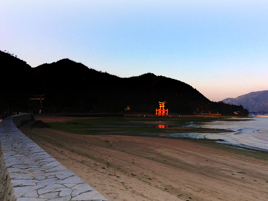 The Great Torii in the afternoon appears to float in Hiroshima Bay
