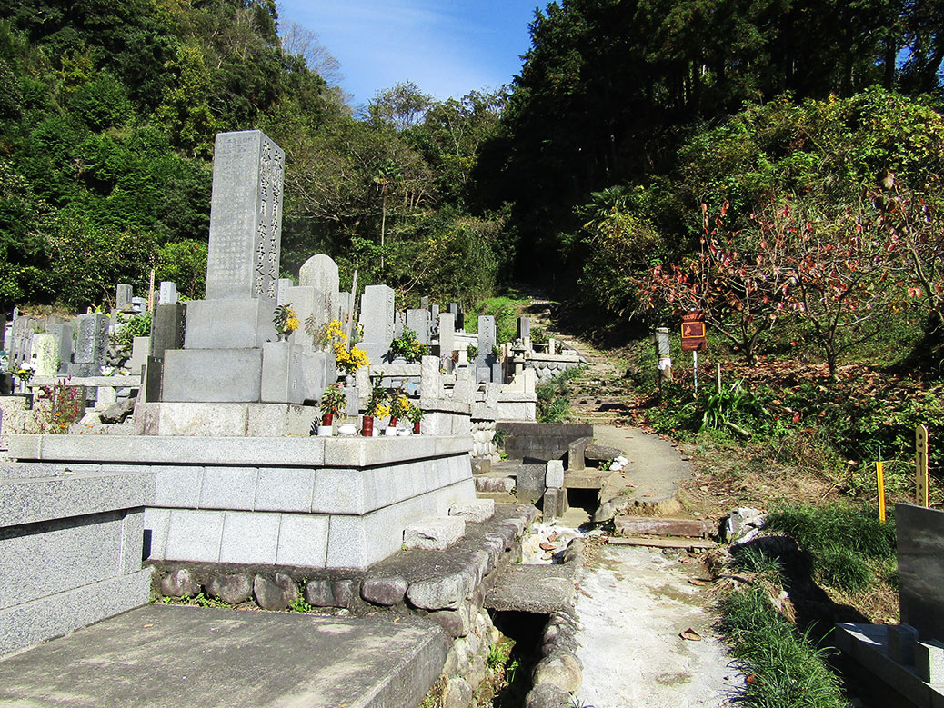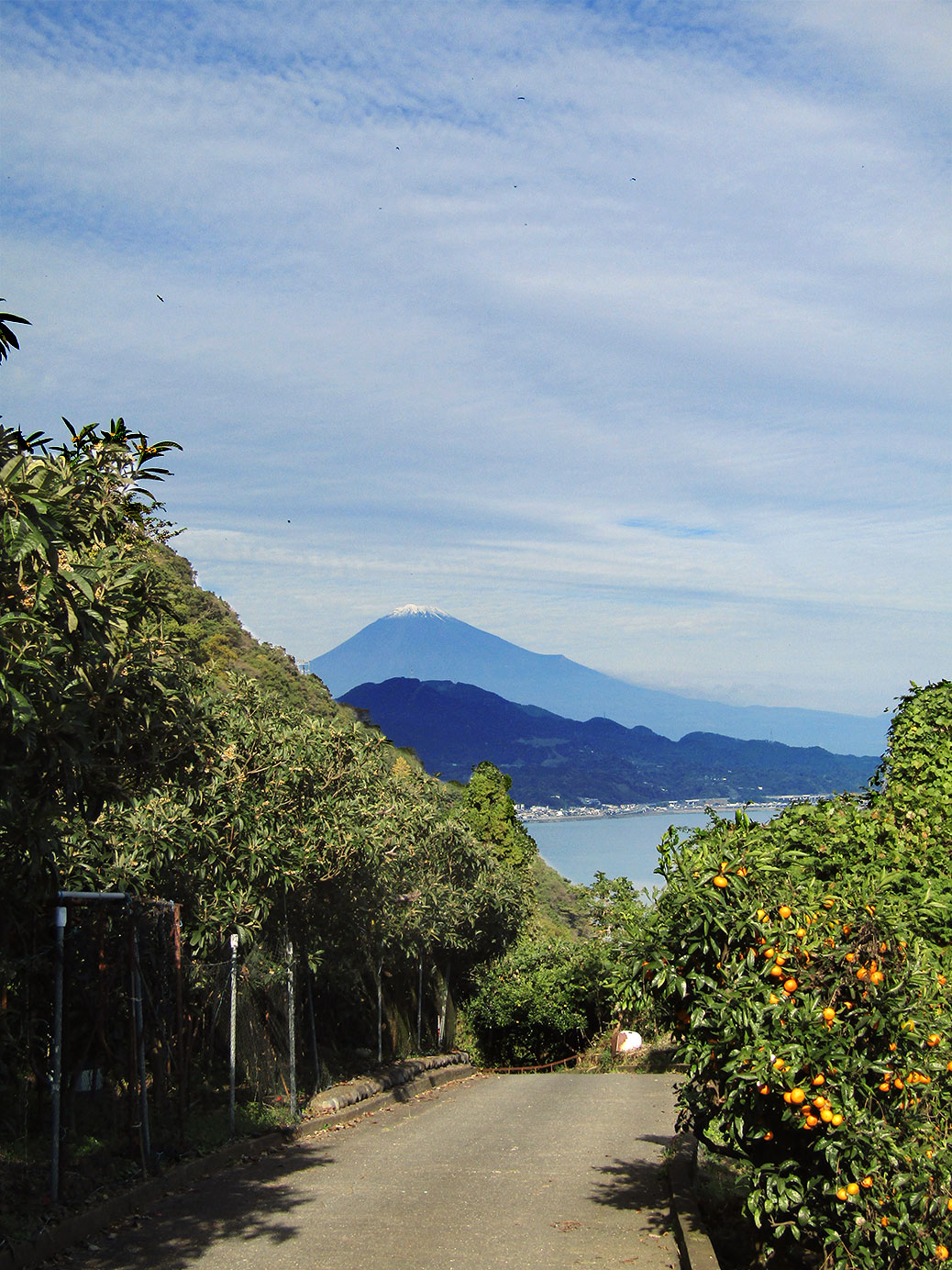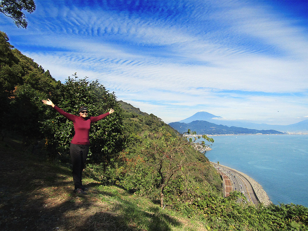 We followed the paved road up through the orchards, the trees plump with bright oranges ready for harvest. Finally we arrived at a proper trail, following it through a cemetery and up another hill. Before long, we came to the marker indicating the stretch known as Satta Pass. Just around the corner, we caught our first view of Mt. Fuji from the pass.