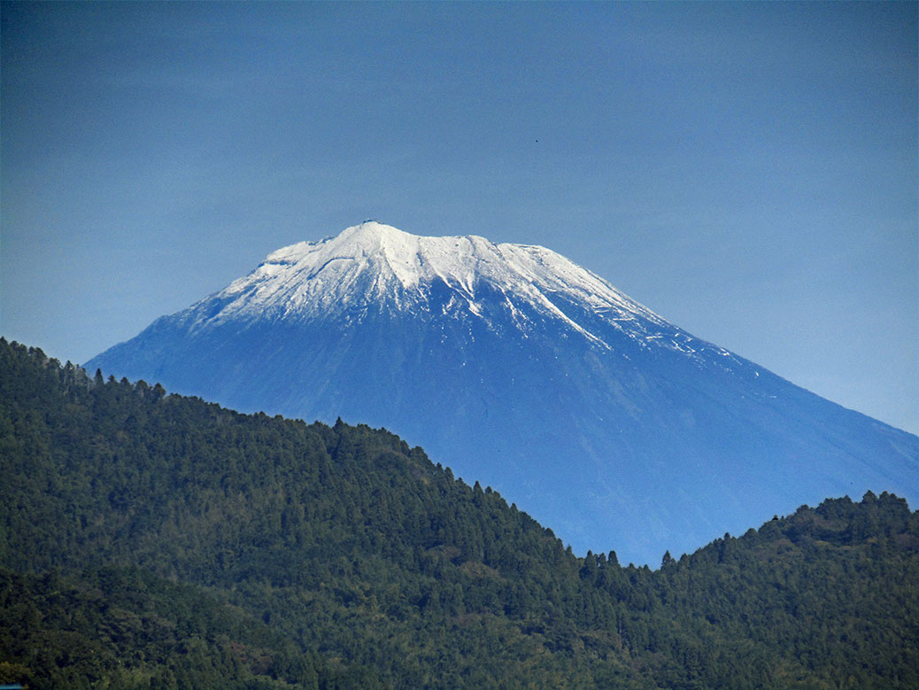 Before heading out, we stopped for breakfast near Shimizu Station. We sat on a sidewalk bench facing the shops, enjoying our meal when I glanced over my shoulder. I nearly choked on my coffee when I saw the imposing Mt. Fuji filling up the background between the buildings. We rotated 180-degrees and finished our meal.