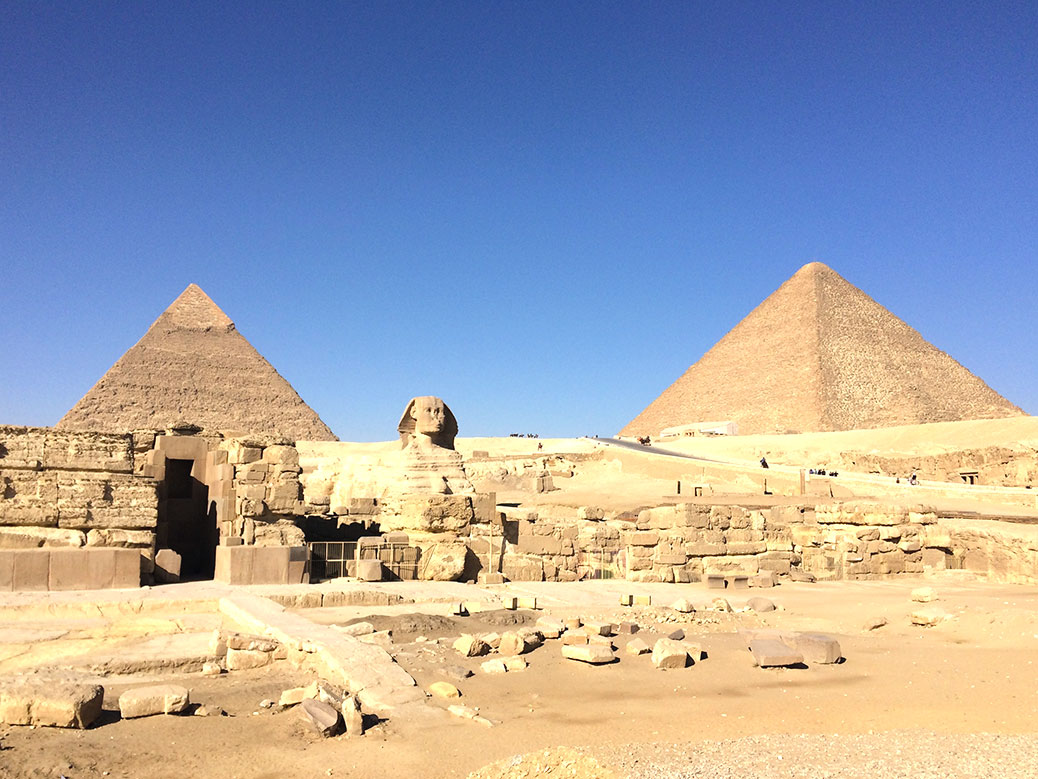 Only a moment later, we left modern-day Egypt behind. From a distance, the pyramids are smooth, three-dimensional triangles, but up-close, you get a sense of how they were born. More than 2 million stone blocks, each weighing more than two tons create a craggy surface. Once covered in white sandstone—some of which can still be seen atop the middle pyramid—the exposed core tells a story of the construction.